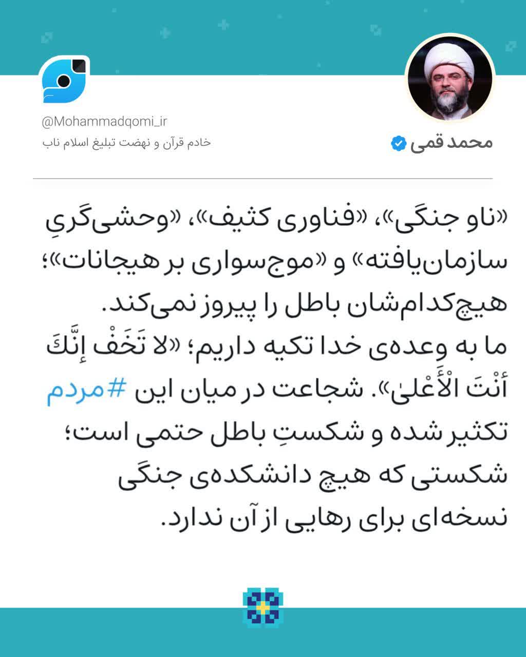 «ناو جنگی»، «فناوری کثیف»، «وحشی‌گریِ سازمان‌یافته» و «موج‌سواری بر هیجانات»؛هیچ‌کدام‌شان باطل را پیروز نمی‌کند. ما به وعده‌ی خدا تکیه داریم؛ «لا تَخَفْ إنَّكَ أنْتَ الْأَعْلىٰ». شجاعت در میان این مردم تکثیر شده و شکستِ باطل حتمی است؛ شکستی که هیچ دانشکده‌ی جنگی نسخه‌ای برای رهایی از آن ندارد.