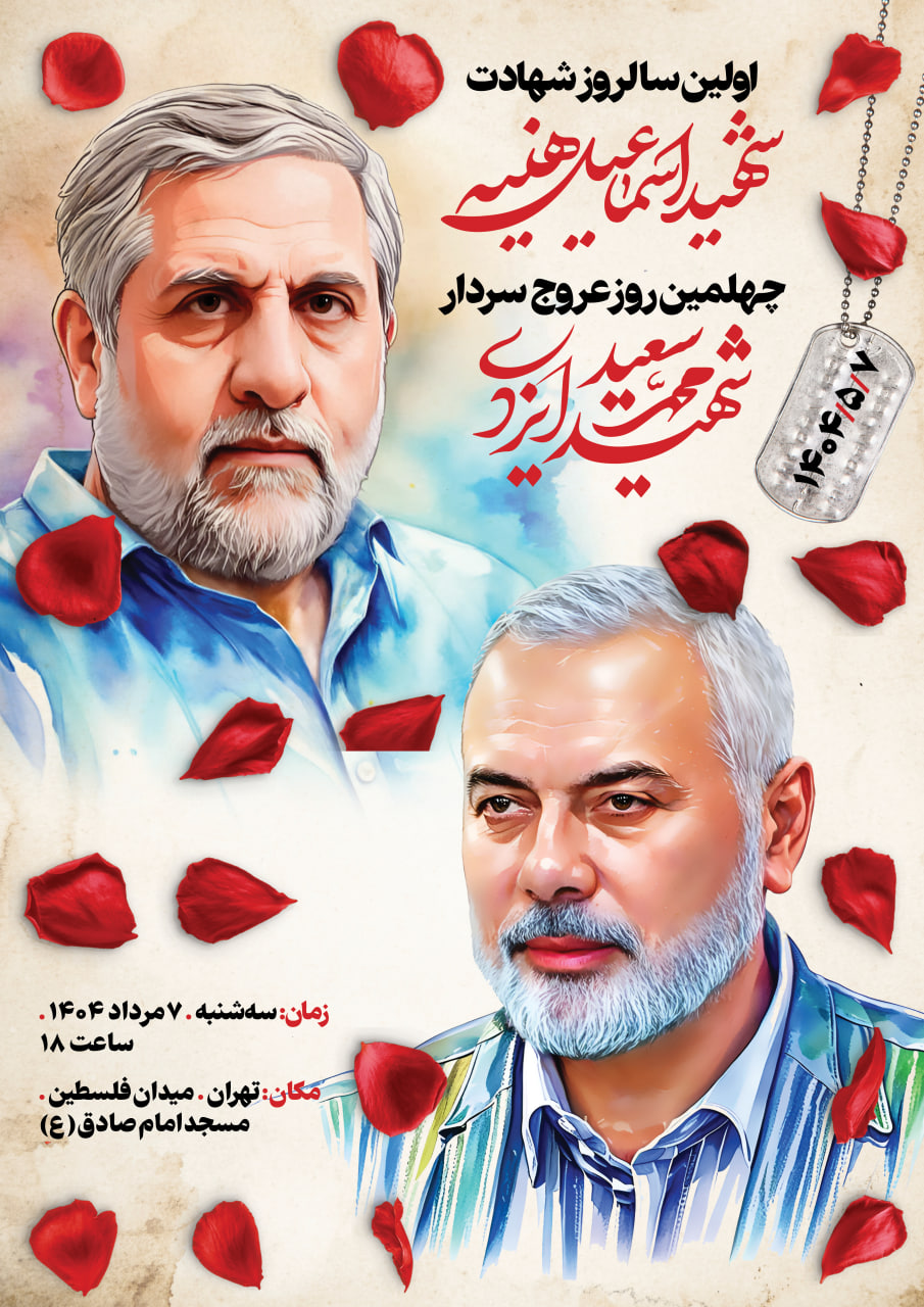 مراسم بزرگداشتی به مناسبت اولین سالگرد شهادت دکتر «اسماعیل هنیه»، رئیس دفتر سیاسی جنبش مقاومت اسلامی (حماس) و همچنین چهلمین روز شهادت سردار «محمد سعید ایزدی» (حاج رمضان)، ۷ مردادماه در مسجد امام صادق تهران برگزار میشود.