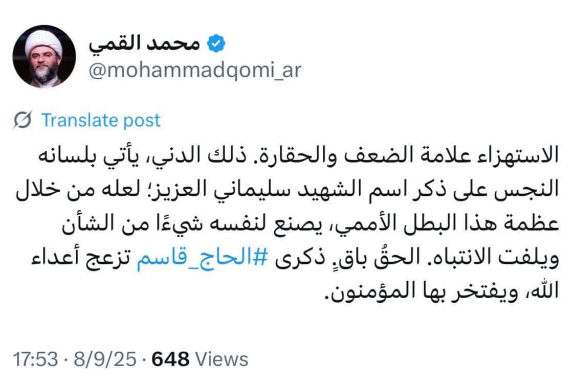 ۲۰ مرداد | واکنش حجتالاسلام محمد قمی به سخنان رئیسجمهور آمریکا درباره شهید سلیمانی