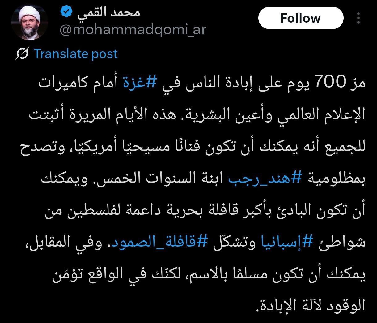 به گزارش روابط عمومی سازمان تبلیغات اسلامی، حجتالاسلام محمد قمی، در صفحه شخصی خود در شبکه اجتماعی ایکس به زبان عربی با اشاره به مصائب مردم غزه بر اثر تداوم حملات رژیم صهیونیستی، سکوت برخی حاکمان کشورهای عربی منطقه را «موتور ماشین نسلکشی» صهیونیستها دانست. رئیس سازمان تبلیغات اسلامی در این توییت نوشت: