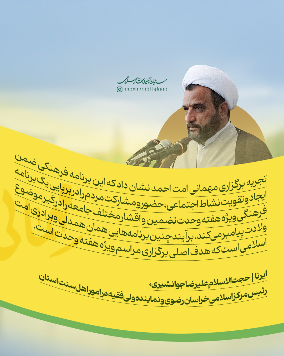 به گزارش روابط عمومی سازمان تبلیغات اسلامی، مهمانی امت احمد و جشن مردمی میلاد پیامبر اکرم سه سال پیش در سنندج آغاز شد و امسال، همزمان با هزار و پانصدمین سال میلاد پیامبر مهربانیها به استانهای مختلف کشور رسید. اینبار جز کردستان، بیش از 8 استان کشور، از سیستان و بلوچستان و بندرعباس تا قم و تهران و گلستان میزبان جشنهای بزرگ مردمی امت احمد در هفته وحدت بودند. جشنهایی که نه تنها رنگ و بوی شادی داشتند، بلکه پیامآور همبستگی و وحدت ملی مردم ایران اسلامی شدند. به همین مناسبت نظر برخی از روحانیون شیعه و اهل سنت را در خصوص مهمانی امت احمد مرور میکنیم.
