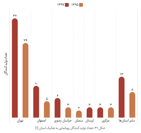 مقایسه آماری جالبی هم از تعداد تولیدکنندگان این صنعت در سالهای ۱۳۹۵ و ۱۳۹۷ وجود دارد: در سال اول ۴۵ تولیدکننده فعال بودند و این عدد در سال دوم به ۶۷ رسید. تهران با ۳۲ استودیو، اصفهان با ۱۰ و خراسان رضوی با ۶، بیشترین سهم را داشتند.